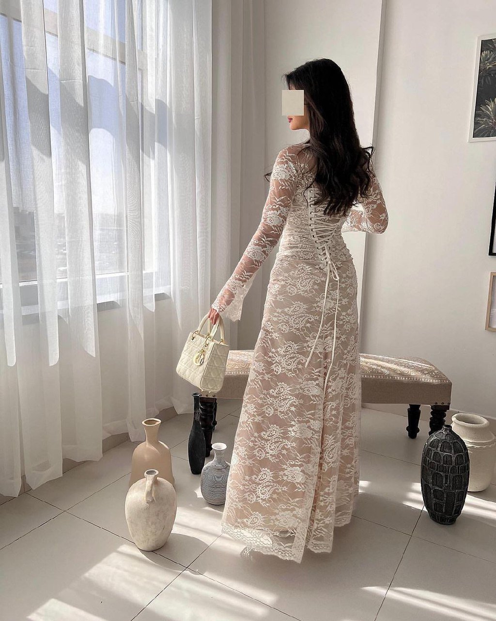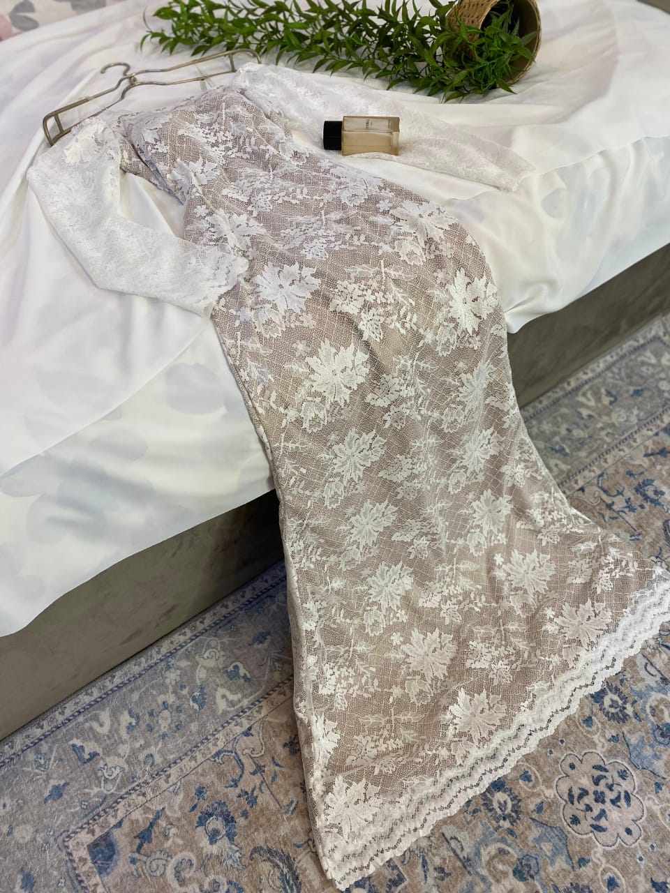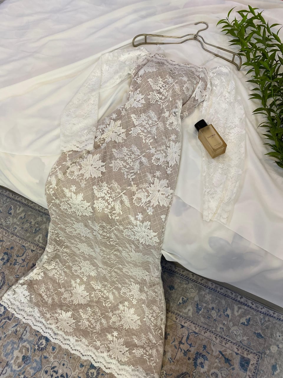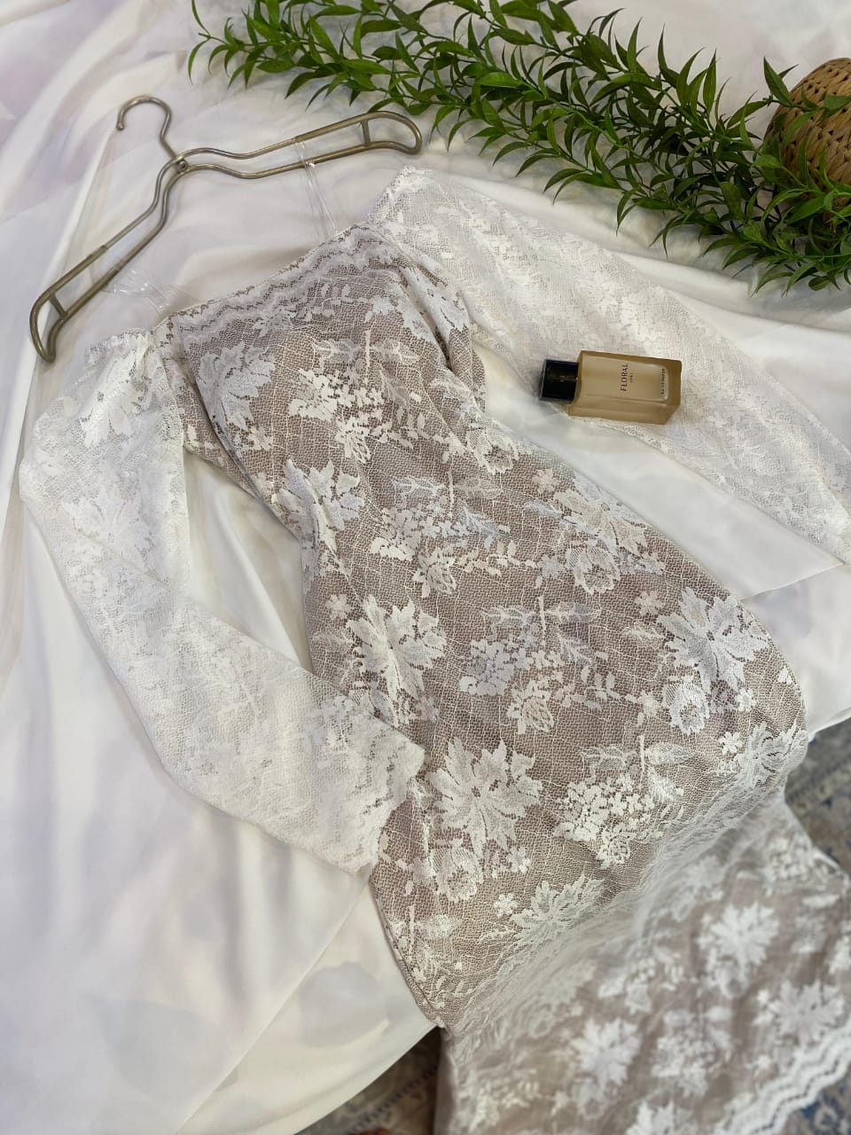 الخامه: خامة: دانتيل ورود ابيض - مبطن بيج