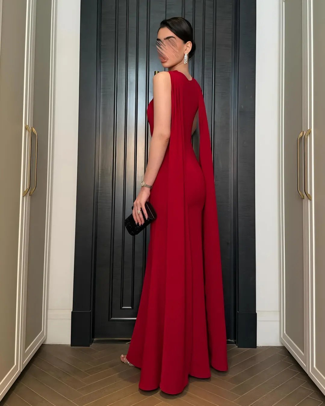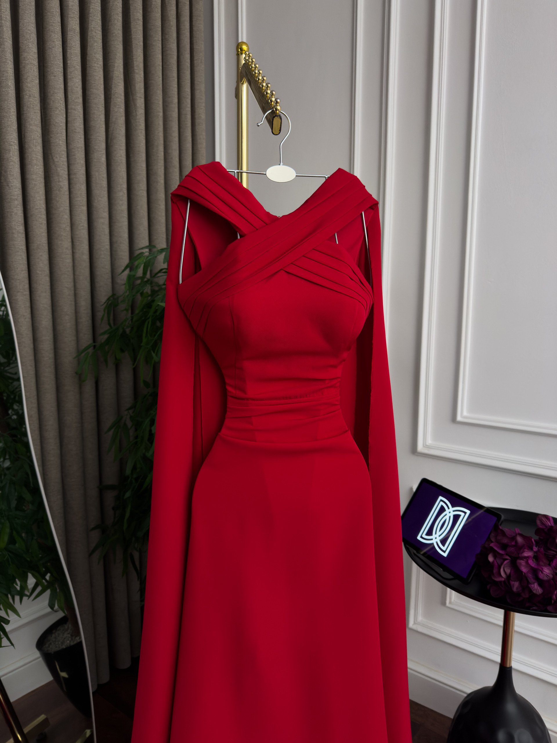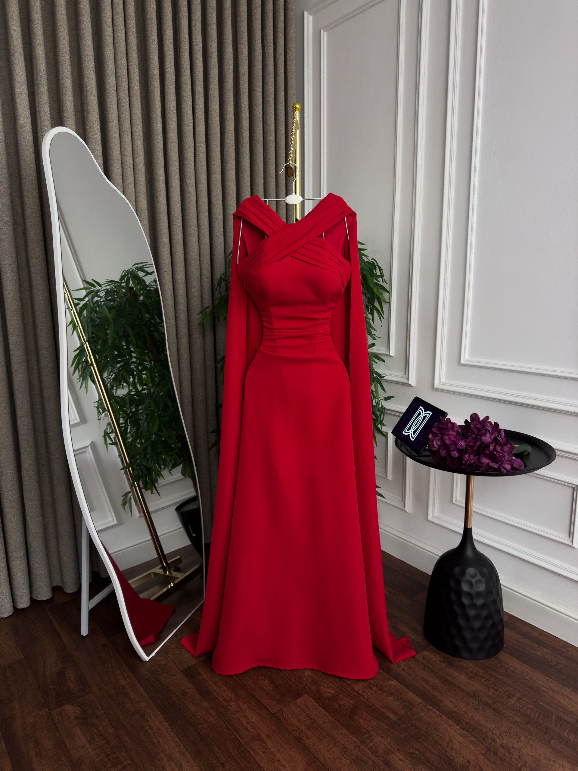 فستان سهرة أحمر طويل بتصميم راقي وبأكتاف متقاطعة