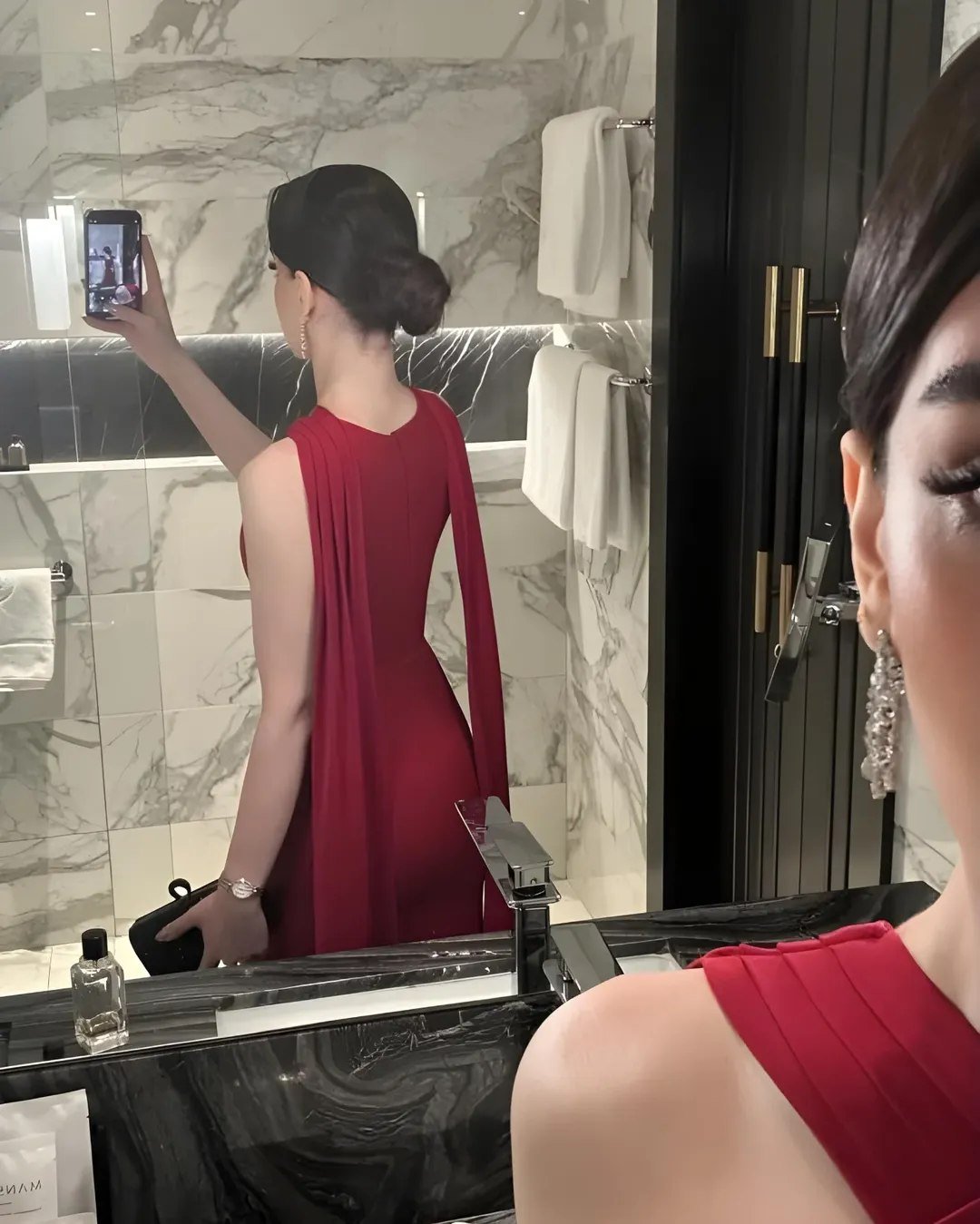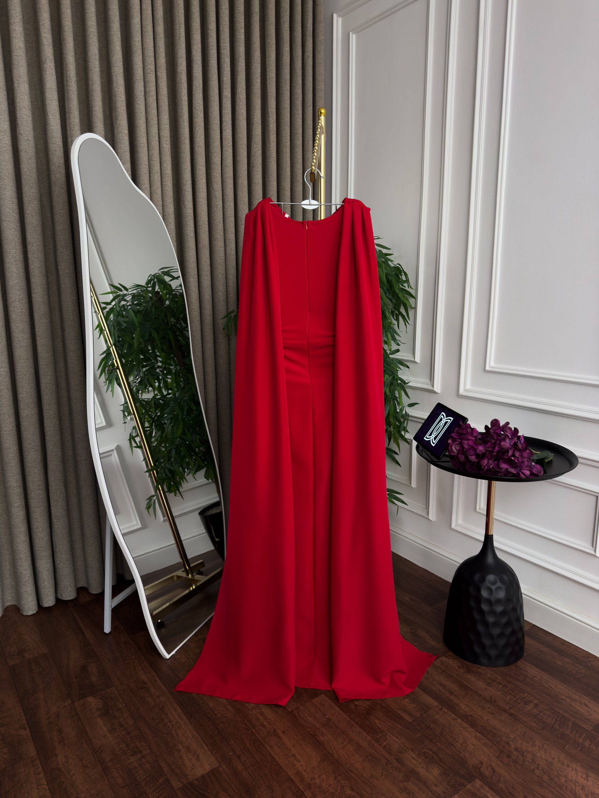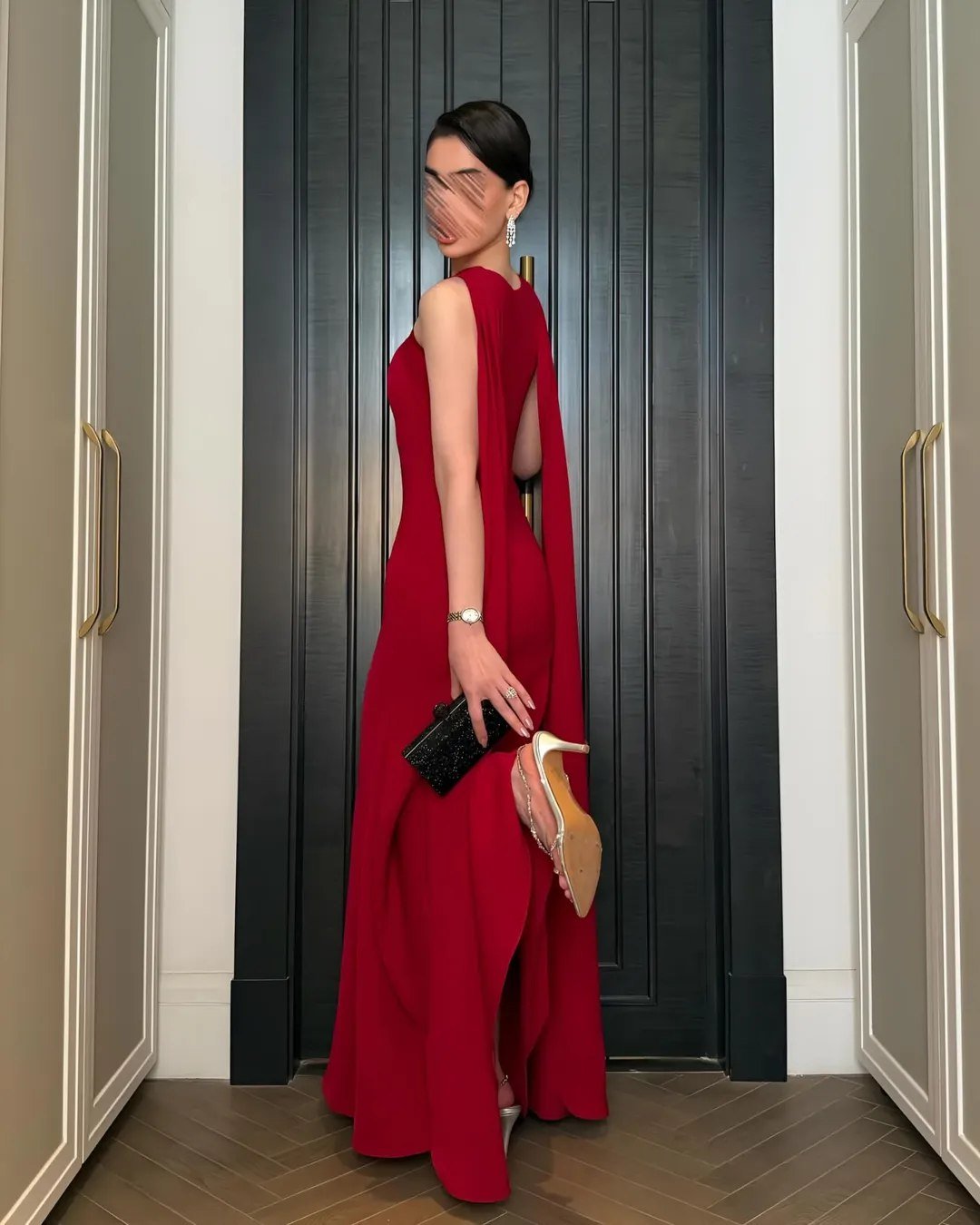 فستان سهرة أحمر طويل بتصميم راقي وبأكتاف متقاطعة