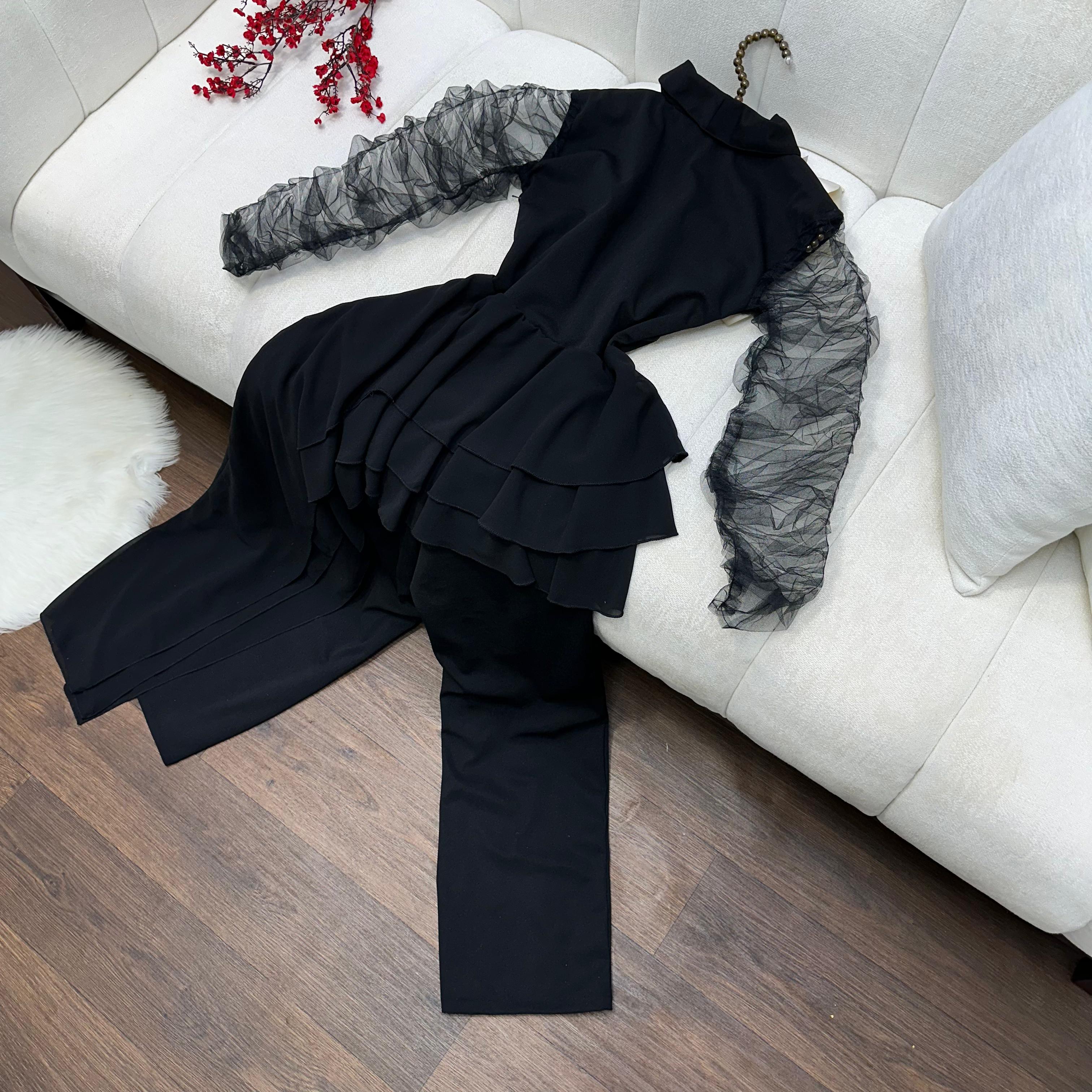 الخامه: كريب لاكرا + شيفون + اكمام تول + ورده من القماش الميكادو على فصوص تطريز